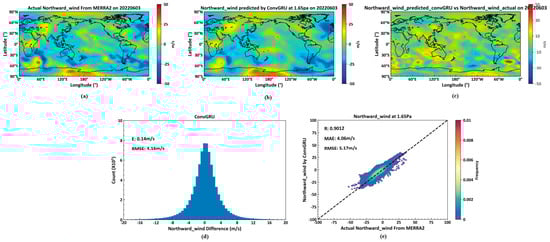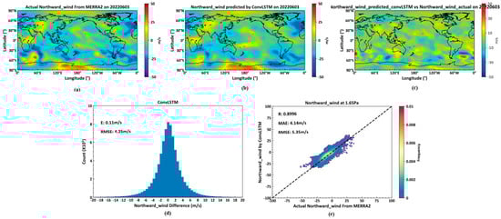As shown in Figure 12, (a) displays actual northward wind data on 3 June 2022, at the 1.65 Pa isobaric height from the MERRA2 dataset. (b) presents northward wind predictions at the same height for 3 June 2022, based on the previous day’s MERRA2 data, generated by a deep learning neural network constructed with ConvLSTM cells. (c) is the pseudocolor map of the difference between actual temperature and predicted temperature. (d) illustrates the average and root mean square errors between actual and predicted northward winds across all 72 isobaric surfaces globally on 3 June 2022. (e) details the correlation coefficient, mean error, and RMSE for northward winds at the 1.65 Pa height.