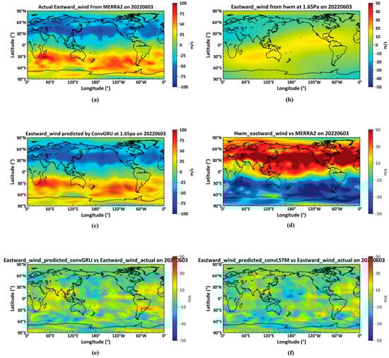 Model performance vs. HWM model. (a): the actual Eastward Wind data on 3 June 2022; (b): the predicted Eastward Wind data by HWM model; (c): the predicted Eastward Wind data by ConvGRU model; (d): the differences between actual Eastward Wind data and data predicted by HWM model; (e): the differences between actual Eastward Wind data and data predicted by ConvGRU model; (f): the differences between actual Eastward Wind data and data predicted by ConvLSTM model.