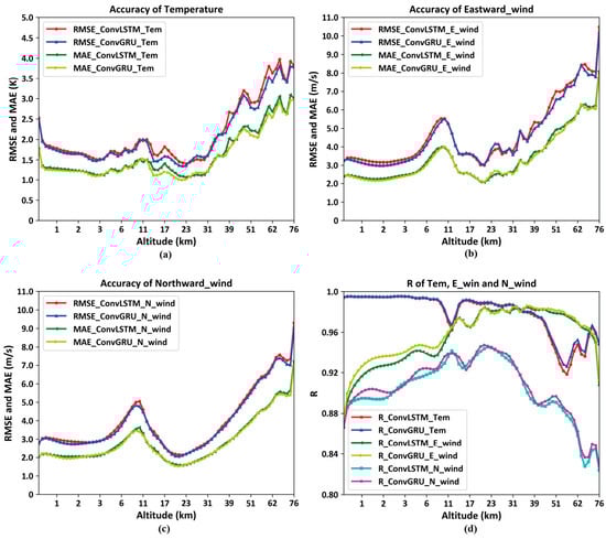 The model trained to use the previous day’s temperature values predicts the root mean square error (RMSE) for temperature values at various altitudes in the first three hours of the next day to be approximately 1.8 K in Figure 7. The RMSE for the predicted eastward and northward wind values compared to the actual measurements also displays notable accuracy, with values of 4.2 m/s and 3.8 m/s in Figure 7, respectively. Moreover, as time progresses, the neural network built with ConvGRU units demonstrates superior performance over the one constructed with ConvLSTM units. Although the former has a simpler structure, it captures long-term temporal information more effectively. This not only supports the reliability of the developed model but also offers guidance for future long-term predictions of near-space atmospheric elements.