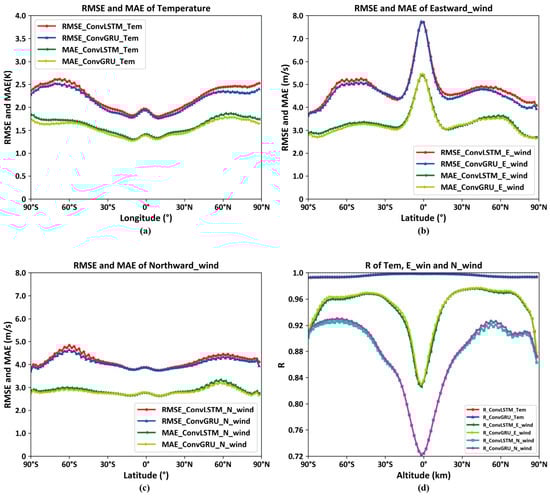 As depicted in Figure 16d shows the correlation coefficient curves of temperature, eastward wind, and northward wind at 96 latitudes, the others display the mean error curves and the root mean square error curves of temperature, eastward wind, and northward wind at 96 latitudes. The following conclusions can be drawn: The models trained through deep learning using ConvGRU and ConvLSTM effectively predict environmental variables at various latitudes, with ConvGRU performing slightly better. Near the polar regions, the prediction results of both models do not exhibit a significant decline, as the MERRA2 dataset utilizes the real-time atmospheric temperature values obtained from the Microwave Limb Sensor (MLS) on the MODIS Aura satellite, which provides improved calibration coefficients for better atmospheric correction in polar regions [,]. This corroborates the conclusion that the MERRA2 dataset has relatively high reliability in polar regions. However, when predicting eastward wind, a considerable decrease in the correlation coefficient is observed near the equatorial regions, accompanied by an increase in mean error and root mean square error, which is related to the fact that the eastward wind values are essentially zero near the equator, as mentioned earlier.