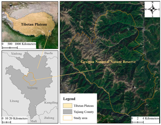 Location of the Gexigou National Nature Reserve in eastern Tibet Plateau. The map is reproduced from Tianditu (https://www.tianditu.gov.cn/, accessed on 05 July 2024).