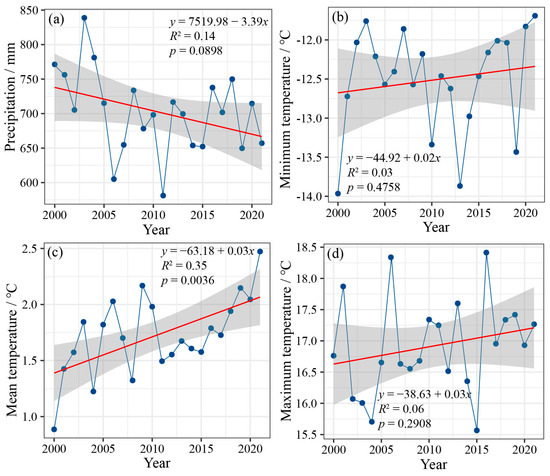 Climate change trends at the timberline: (a) precipitation, (b) minimum temperature, (c) mean temperature, and (d) maximum temperature. The red line represents the linear trend of climate variables.