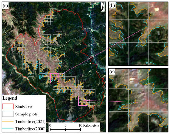 Our methodology for the extraction of timberline based on Landsat imagery obtained an accurate timberline map (Figure 4). Based on the results, the timberline area was divided into 195 sample plots, each measuring 1000 m × 1000 m (Figure 4a). Compared with 2000, the timberline showed a clear upward shift in 2021 (Figure 4b,c).