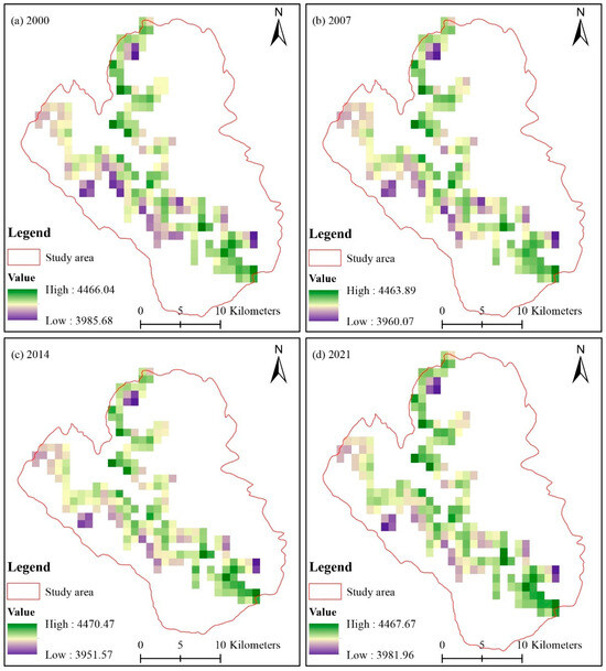 The spatial distribution of the timberline exhibited a consistent pattern across the four periods, with the timberline elevation being higher in the central area and lower in the surrounding regions. This pattern aligns with the topographic features of the research area, as depicted in Figure 5. The elevation range of the timberline in the study area was 3985.68~4466.04 m (ranging 480.36 m) in 2000 (Figure 5a), 3960.07~4463.89 m (ranging 503.82 m) in 2007 (Figure 5b), 3951.57~4470.47 m (ranging 518.90 m) in 2014 (Figure 5c), and 3981.96~4467.67 m (ranging 485.71 m) in 2021 (Figure 5d). The minimum elevation of the timberline exhibits a decreasing trend followed by an increasing trend across the four periods, whereas the maximum timberline elevation remains relatively stable within a range of 4463.89 to 4470.47 m. Additionally, the range of timberline elevations shows an initial increase followed by a subsequent drop.