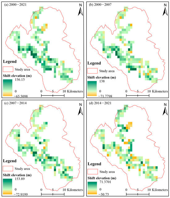 Timberline altitude shift in (a) 2000–2021, (b) 2000–2007, (c) 2007–2014, and (d) 2014–2021.