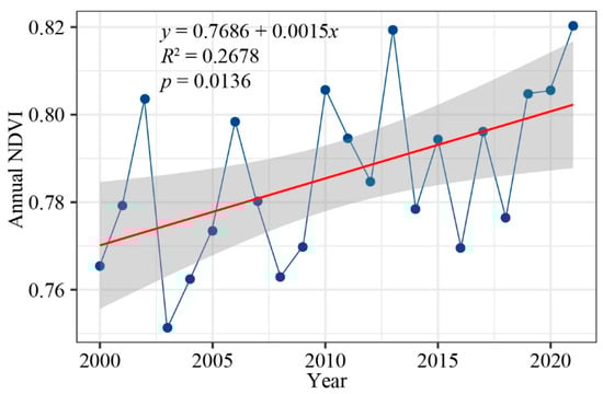 Trends in annual NDVI changes in the timberline area. The red line represents the linear trend of the annual NDVI.