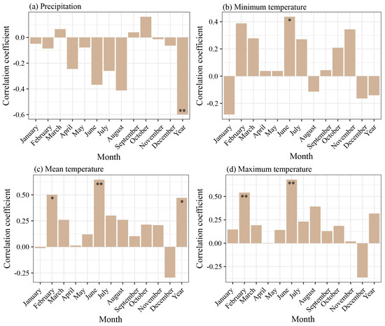Pearson correlation between timberline annual NDVI and climatic variables, (a) precipitation, (b) minimum temperature, (c) mean temperature, and (d) maximum temperature. * Indicates a significant correlation (p < 0.05), and ** indicates an extremely significant correlation (p < 0.01).