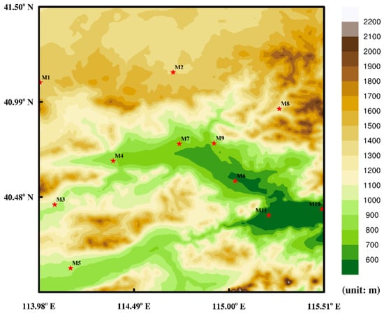 The topography and distribution of national meteorological stations in the study area. M1—Shangyi, M2—Zhangbei, M3—Tianzhen, M4—Huai’an, M5—Yangyuan, M6—Xuanhua, M7—Wanquan, M8—Chongli, M9—Qiaodong, M10—Huailai, M11—Zhuolu.