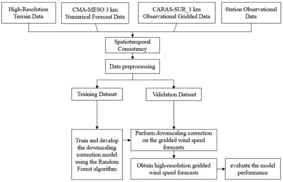 Flowchart of the wind speed gridded downscaling correction model using the random forest algorithm.