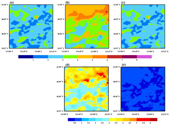 Spatial distributions of the mean wind speed by CARAS-SUR_1 km (a), CMA-MESO 3 km (b), downscaling corrected forecast (c), the root mean square error (RMSE) of forecasting wind speed (d), and downscaling corrected wind speed (e) in the study area in 2022 (unit: m/s).