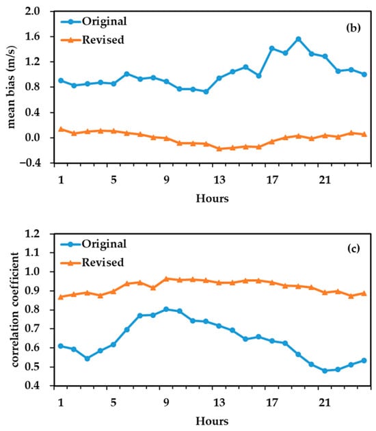 The wind speed forecast performance statistics for the 1–24 h forecast lead times in 2022 are shown in Figure 5. The forecast errors of the original model generally increase with the forecast lead time, especially after the 12 h forecast lead time, where the RMSE is consistently above 2 m/s and the mean bias (BIAS) is consistently above 1 m/s. Specifically, the RMSE for the 17 h and 19 h forecast lead times exceed 2.40 m/s, and the BIAS exceeds 1.40 m/s. Downscaling correction significantly improves the wind speed forecast performance for all 1–24 h forecast lead times. The RMSE for each forecast lead time decreases substantially after correction, with the corrected RMSE around 0.60 m/s. Specifically, the RMSE for the 17 h and 19 h forecast lead times decreases by 1.74 m/s and 1.83 m/s, respectively, while the RMSE for other forecast lead times decreases by 1.12–1.69 m/s, with an RMSE improvement rate of approximately 70%. The BIAS for each forecast lead time is close to 0 m/s after correction. The correlation coefficient (R) improves from 0.48–0.80 to around 0.90 after correction. Overall, the downscaling correction significantly enhances the wind speed forecast performance for all 1–24 h forecast lead times, and the errors are stable after correction, basically eliminating the systematic errors of the model forecasts. In contrast, the wind speed correction forecast errors in [,,,,] show a significant increasing trend with longer forecast lead times, with [] reporting that the 12–24 h forecast errors are significantly larger than the 0–12 h forecast errors. This study’s downscaling correction demonstrates a clear advantage. Among them, the forecast lead times of 6 h, 9 h, 15 to 17 h, 19 to 21 h, and 24 h show the greatest improvement, with RMSE improvement rates exceeding 70%. The 6 h and 19 h forecast lead times have the highest improvement rates, exceeding 74%.