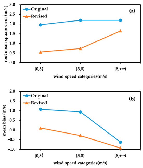 To evaluate the performance of the wind speed grid downscaling correction model under different wind speed levels, the observed wind speeds from national meteorological stations are divided into three categories: less than 3 m/s, between 3 and 8 m/s, and greater than or equal to 8 m/s. During the validation period, the sample sizes for these categories are 8402 (74.01%), 2786 (24.54%), and 164 (1.45%), respectively. The wind speed forecast performance statistics for different wind speed levels are shown in Figure 6. The forecast errors of the original model are relatively stable across all wind speed levels, with RMSE values around 2 m/s. The mean bias (BIAS) for wind speeds below 8 m/s is approximately 1 m/s, while for wind speeds above 8 m/s, the BIAS is −0.62 m/s, indicating that the model tends to overestimate wind speeds below 8 m/s and underestimate wind speeds above 8 m/s. Downscaling correction significantly improves the forecast accuracy for all wind speed levels, particularly for wind speeds below 8 m/s. For wind speeds below 3 m/s and between 3 and 8 m/s, the corrected RMSE values are 0.55 m/s and 0.73 m/s, respectively, reduced by approximately 1.45 m/s compared to the original forecasts, with RMSE improvement rates of 71.85% and 66.70%, respectively. The BIAS values for these categories are 0.11 m/s and −0.28 m/s, respectively, and the correlation coefficient (R) improves from 0.39–0.50 to around 0.80. For wind speeds above 8 m/s, the corrected RMSE is 1.65 m/s, reduced by 0.55 m/s, with an RMSE improvement rate of 24.98%. The BIAS is −0.93 m/s, slightly lower than the original model, likely due to the model’s tendency to significantly underestimate wind speeds during some strong wind events. The correlation coefficient (R) for this category improves significantly from 0.23 to 0.53. Overall, the downscaling correction has a significant effect on wind speed forecasts under all wind speed levels, particularly for wind speeds below 8 m/s, with RMSE improvement rates around 70%. Due to the fact that the ground truth grid data tend to underestimate wind speeds under strong wind conditions compared to observations, the downscaled corrected forecasts for strong winds are likely to be more noticeably underestimated. Future work can involve a detailed analysis of the wind speed distribution characteristics of the ground truth grid data under strong wind conditions, which can be used to further correct the forecasts for strong wind scenarios, thereby improving the accuracy of strong wind forecasts.