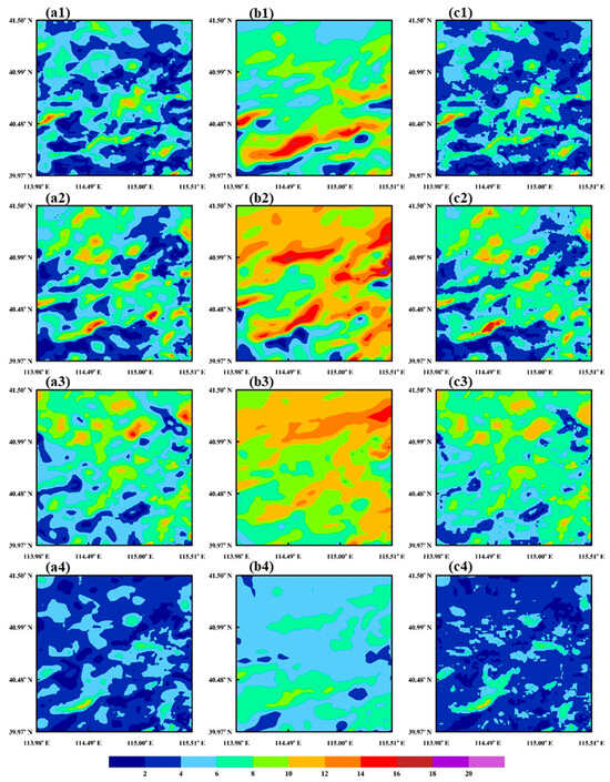 Spatial distributions of near-surface observed wind speed from CARAS-SUR_1 km (a1,a2,a3,a4), forecasted wind speed from CMA-MESO 3 km (b1,b2,b3,b4), and downscaling corrected forecasted wind speed (c1,c2,c3,c4) at 02:00, 07:00, 13:00, and 19:00 on 26 April 2022 in the study area (unit: m/s).