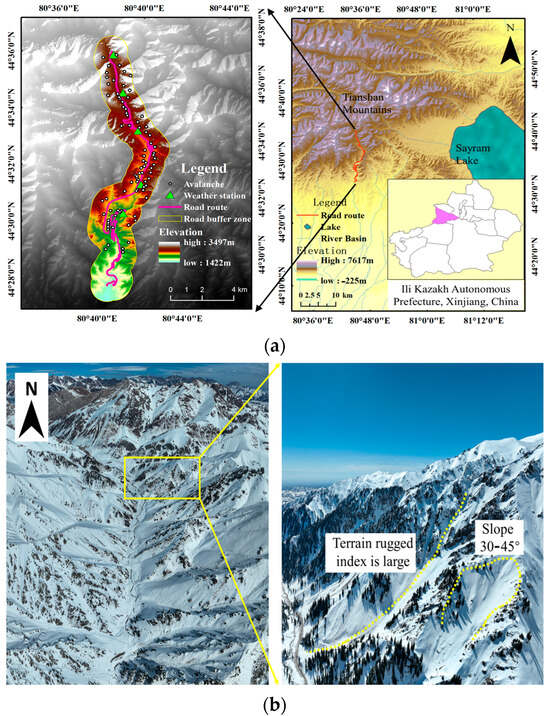 The G219Wen Quan to Khorgos transportation corridor (hereafter referred to as the transportation corridor) is oriented in the southeast direction in the Beizhentai Mountains, a branch of Western Tien Shan, and is bordered by Sayram Lake in the east and the Boroko Nu Mountains (Figure 1a). The study area is the geomorphological demarcation line between the Bortala Valley and the pre-hills and plains of the Khorgos Mountains. The topography is high in the center and low on both ends and is characterized by severe surface cuts, steep mountains, large changes in the topographic relief, and geomorphology that is characterized by low to medium mountains and river valleys [34]. The elevation is 1.4–3.5 km and the slope gradient is between 30 and 60° (Figure 1b). The vertical geographic distribution structure of the mountain system is obvious, and the data from the meteorological stations in the study area show that the snow depth can reach up to 1.6 m, so the meteorological and topographic conditions create favorable conditions for avalanche development.