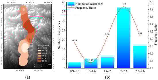 The wind affects the density and stability of the snow layer, facilitating the triggering of avalanche disasters. The ArcGIS spatial interpolation tool and weather station data were used to derive the average winter wind speeds in other regions. The average winter wind speeds in the study area were around 0.9–2.6 m/s. The average winter wind speeds were reclassified into five levels: 0.9–1.3 m/s, 1.3–1.6 m/s, 1.6–2 m/s, 2–2.3 m/s, and 2.3–2.6 m/s. When the monthly mean wind speed increases to 1.6 m/s, the frequency ratio is 1.06, which favors avalanches. Details are shown in Figure 5.