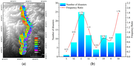 As the sunshine, snowfall, and wind speed are different for different slope aspects, the snow depth and snow layer characteristics are different for different slope aspects, which further affects avalanche development. The DEM of the slope aspect of the study area with a 12.5 m spatial resolution was calculated using ArcGIS software, and the slope aspect was reclassified into eight classes ((19)): north (337.5–22.5°), northeast (22.5–67.5°), east (67.5–112.5°), southeast (112.5–157.5°), south (157.5–202.5°), southwest (202.5–247.5°), west (247.5–292.5°), and northwest (292.5–337.5°). The calculation results show that the east, southeast, and northwest slope aspects are favorable for the development of avalanche hazards in the transportation corridor. The frequency ratios are all >1, and the largest frequency ratios are for the east and northwest slope aspects. Details are shown in Figure 11.