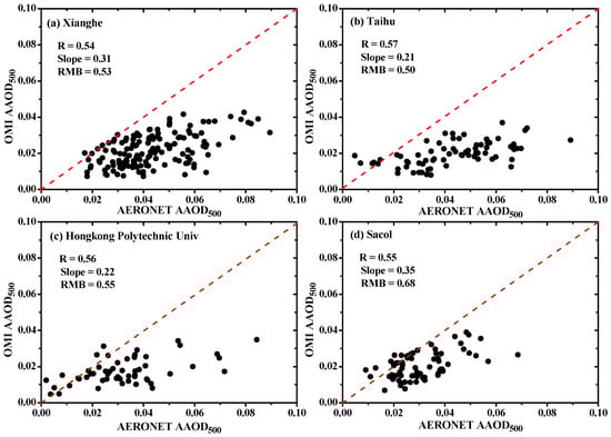 The correlation coefficient (R) for all sites is significant at the 0.01 level coherently. The R between the OMI and AERONET fluctuated around 0.55. Relative mean bias (RMB) is utilized to express the accuracy of AAOD data, and values greater than 0.5 are considered reliable []. Compared with the monthly average data, some more robust results were obtained for daily data as the sample size increased. For example, the R and RMB slightly increased from 0.54 and 0.53 to 0.56 and 0.58 in Xianghe from 2005 to 2018, respectively (Figure 2a). The total slope was 0.21–0.35, deviating from the predetermined 1:1 path (red dashed line), implying that the OMI product underestimated the AAOD500 in Xianghe (RMB = 0.53), Taihu (RMB = 0.50), Hongkong Polytechnic Univ (RMB = 0.55), and Sacol (RMB = 0.68). The underestimation was caused by the overestimation in the estimated surface reflectance [].