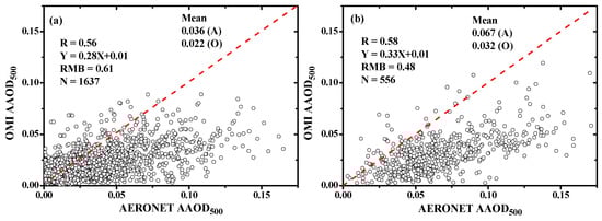 In Figure 3, 4452 daily 500 nm AAOD values for the time period of 2005–2018 were compared between the satellite-based OMI and ground-based AERONET at the above four sites. In general, the AERONET AAOD was higher than the OMI AAOD in all seasons and months. The seasonal distribution of AERONET AAOD exhibited the highest AAOD500 values in spring (0.042 ± 0.028) and winter (0.041 ± 0.034), followed by autumn (0.031 ± 0.025) (Figure 3a). The summer displayed the lowest AAOD value (0.026 ± 0.025). OMI AAOD500nm retrievals revealed a similar temporal pattern in the order of winter (0.027 ± 0.033) ~ spring (0.025 ± 0.020) > autumn (0.018 ± 0.028) ~ summer (0.019 ± 0.013). As shown in Figure 3b, the lowest AAOD values were in the months of July (0.017 ± 0.010) for AERONET and September (0.014 ± 0.010) for the OMI, respectively. Zaman carried out validation of the OMI AAOD500 with AERONET measurement, and also found lower AAOD values compared to the AERONET-AAOD with a distinct annual cycle [].