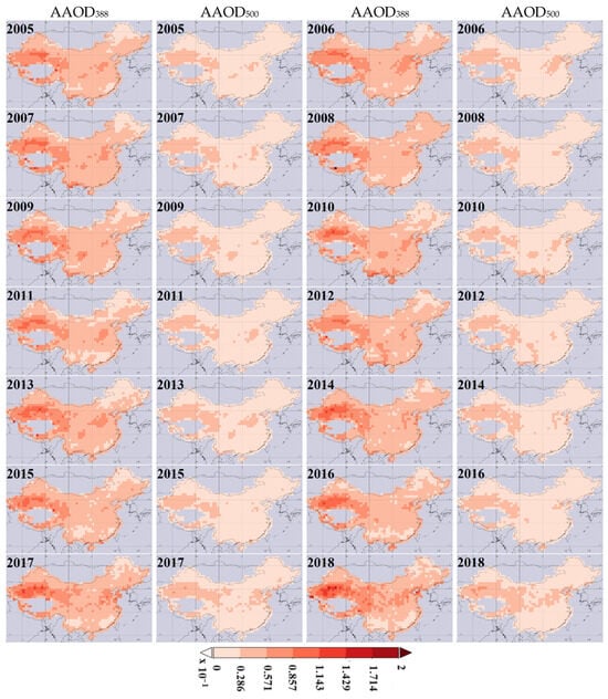 Distribution of AAOD388 and AAOD500 over China from 2005 to 2018.