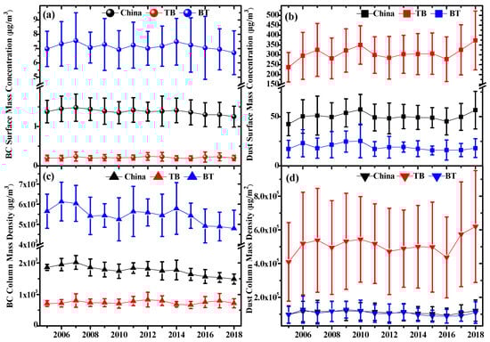 Annual variation in area-average BC surface mass concentration (a), dust surface mass concentration (b), BC column mass density (c), and dust column mass density (d) over the study area in China, the TB, and BT from 2005 to 2018.