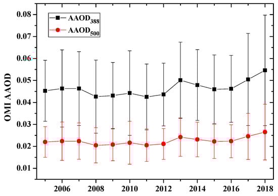 Annual variation in area-average OMI AAOD388 and AAOD500 in China from 2005 to 2018.