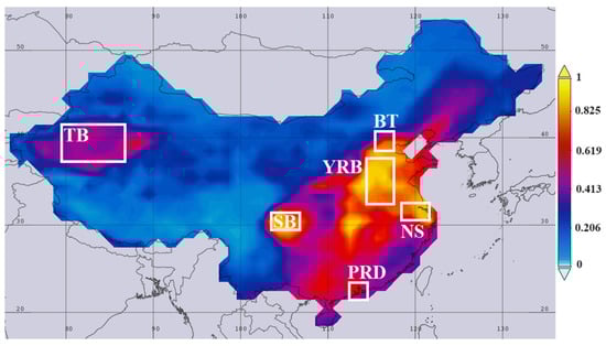 The MODIS reanalysis data are utilized to distinguish sandstorms, fog, and haze, as well as cirrus clouds []. The mean AOD values at 550 nm area-averaged over China derived from the MODIS true-color images with a spatial resolution of 1 × 1 km in the TB (37.5–41.5° N, 79.5–86.5° E), the SB (29.5–31.5° N, 103.5–106.5° E), the Pearl River Delta (PRD) (21.5–23.5° N, 112.5–114.5° E), Nanjing and Shanghai (NS) (30.5–32.5° N, 118.5–121.5° E), the Yellow River Basin (YRB) (32.5–37.5° N, 114.5–117.5° E), and BT (38.5–40.5° N, 115.5–117.5° E) over 2005–2018 are all higher than 0.5, indicating the impact of aerosols from regional air pollution. The geographical locations of the six regions marked with white boxes are shown in Figure 7. The spatiotemporal properties of the AAOD and AAE are studied in the above six representative regions based on the latest OMI.