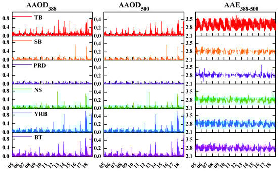 Figure 8 exhibits temporal variations of the AAOD388, AAOD500, and AAE388–500 in the six typical geographic areas from 2005 to 2018. The effective monitoring days in the TB, the SB, the PRD, NS, the YRB and BT were 4187, 1401, 1425, 1976, 3032, and 2918, respectively. Hence, the temporal changes in the TB region were the most regular. Generally, the annual mean AAOD during 2015–2018 was in the order of TB > YRB > BT > SB > NS > PRD. It is not surprising that the maximum AAOD388 was found over the TB, ranging from 0.073 to 0.140, followed by the YRB (0.053–0.077), BT (0.042–0.066) and the SB (0.039–0.050). However, compared to the aforementioned regions, the overall AAOD388 of the PRD (0.029–0.051), and NS (0.036–0.062) was lower, implying lighter AAOD pollution, and smaller values are associated with lower population and aerosol loads.