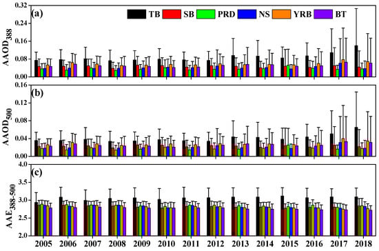 Annual variations of the AAOD388 (a), AAOD500 (b), and AAE388–500 (c) between 2005 and 2018 in six sampling areas.