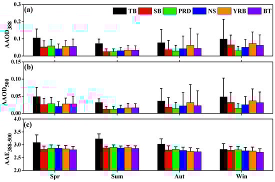 Seasonal variations of the AAOD388 (a), AAOD500 (b), and AAE388–500 (c) from 2005 to 2018 in six sampling areas.