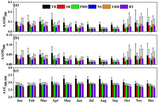 Monthly variations of the AAOD388 (a), AAOD500 (b), and AAE388–500 (c) in six sampling areas.