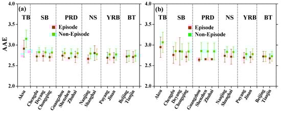 We selected 13 monitoring cities from six regions (the TB: Aksu; the SB: Chengdu, Deyang, Chongqing; the PRD: Guangzhou, Shenzhen, Zhuhai; NS: Nanjing, Shanghai; the YRB: Puyang, Jinan; BT: Beijing, Tianjin) to study the diversities in the AAE between PM2.5 episode days and non-episode days (Figure 12). As compared to other cities, more episode days and higher AAE values occurred in Aksu over the Tarim Basin during 2017 and 2018. As discussed above, the AAE values were significantly affected by dust aerosols from the Taklimakan Desert. Guangzhou, Shenzhen, and Zhuhai, belonging to the YRD, had the minimum number of episode days. Furthermore, the AAE values on these days were regularly low, especially in 2018 with the most obvious difference. Beijing and Tianjin in the BT area displayed no significant differences of AAEs between episode days and non-episode days. In 2018, the AAE388–500 over industrial-emission-dominant regions like Guangzhou, Shanghai, and Beijing was 2.64 ± 0.044, 2.71 ± 0.18, and 2.72 ± 0.13 for episode days, and 2.85 ± 0.20, 2.83 ± 0.13, and 2.72 ± 0.12 for non-episode days. The AAEs obtained for episode days were generally lower than those in non-episode days.
