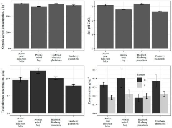 In the soil layer of 50–100 cm (Appendix A, Figure A1), the highest levels of Corg., Ntot., and P were found in active peat extraction fields. In contrast, the lowest average Corg. content was observed in the pristine raised bogs, while the concentrations of Ntot., P, and K, as well as the soil pH, were lowest in cranberry plantations on former peat extraction fields.