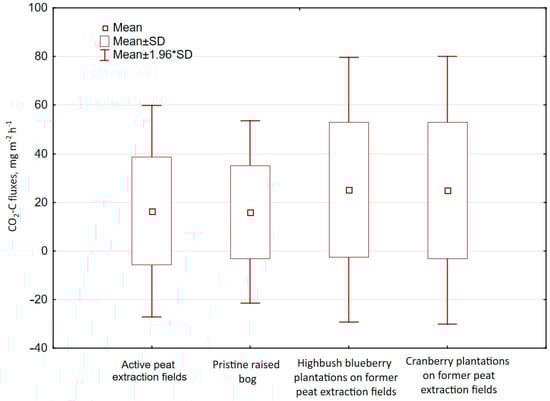 The highest mean CO2–C fluxes reflecting soil heterotrophic respiration were observed in highbush blueberry and cranberry plantations on former peat extraction fields (higher by 8.8 and 8.6 mg m−2 h−1 compared to active peat extraction fields). The lowest mean CO2–C fluxes (16.0 mg CO2–C m−2 h−1) were recorded in the pristine raised bogs, which was even lower (by 0.4 mg CO2–C m−2 h−1) than in the active peat extraction fields (Figure 3). If we evaluate the mean CO2–C fluxes using the coefficient of variation (CV), the smallest deviations were observed in the highbush blueberry and cranberry plantations on former peat extraction fields (110.0 and 112.0%, respectively). In active peat extraction fields, the CV was 135.0%, while in the pristine raised bogs—119.6%.