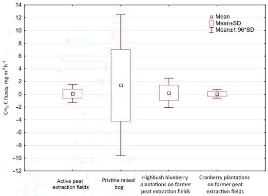 The highest mean CH4-C fluxes were observed in the pristine raised bogs (1.43 mg CH4-C m−2 h−1, Figure 4), while the CV in the pristine raised bogs was the lowest (395.4%). In other types of land use, significantly lower mean CH4-C fluxes were observed, with 0.12 mg CH4-C m−2 h−1 in active peat extraction fields (CV 580.8%), 0.24 mg CH4-C m−2 h−1 in highbush blueberry plantations (CV 495.8%), and 0.07 mg CH4-C m−2 h−1 in cranberry plantations (CV 471.8%).