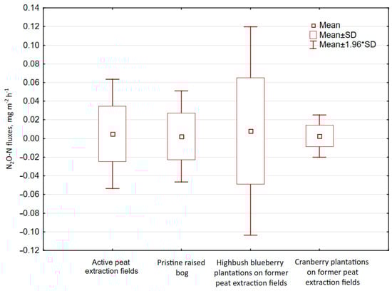 The magnitude of N2O-N fluxes (Figure 5) was significantly lower compared to other GHGs. However, the highest mean N2O-N fluxes were observed in highbush blueberry plantations (0.008 mg N2O-N m−2 h−1, CV 697.5%), while in cranberry plantations, the mean N2O-N fluxes were lower (0.003 mg N2O-N m−2 h−1, CV 432.5%). The lowest mean N2O-N fluxes were observed in the pristine raised bogs (0.002 mg N2O-N m−2 h−1); however, the CV was the highest (1097.0%).