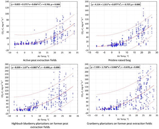 Polynomial regressions (red lines) describing dependence of CO2–C fluxes (soil heterotrophic respiration, blue points) on air temperature in studied types of land use and vegetation. Area between red dashed lines corresponds to 95% confidence interval.