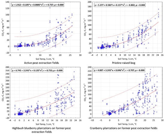 Polynomial regressions (red lines) describing dependence of CO2–C fluxes (soil heterotrophic respiration, blue points) on soil temperature at a depth of 5 cm in studied types of land use and vegetation. Area between red dashed lines corresponds to 95% confidence interval.