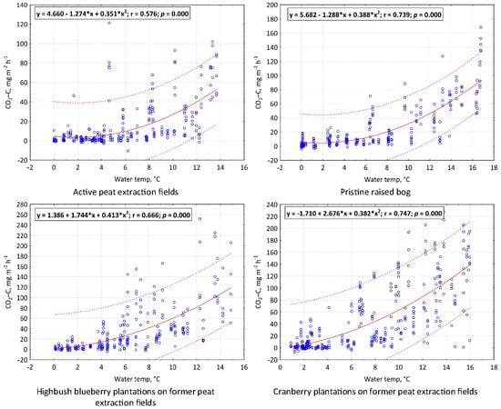 Polynomial regressions (red lines) describing dependence of CO2–C fluxes (soil heterotrophic respiration, blue points) on groundwater temperature in studied types of land use and vegetation. Area between red dashed lines corresponds to 95% confidence interval.