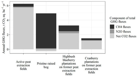 A summary of estimated cumulative annual GHG fluxes expressed in CO2 equivalents using global warming potential (GWP) values for a 100-year time horizon [42] is provided in Figure 9. The highest total GHG fluxes (sum of annual net CO2 fluxes, CH4 fluxes, and N2O fluxes) were observed in active peat extraction fields (6.23 t CO2 eq. ha−1 y−1), while the lowest were in cranberry plantations (1.50 t CO2 eq. ha−1 y−1). In active peat extraction fields, highbush blueberry, and cranberry plantations, the net CO2 fluxes formed the largest contribution to total GHG emissions—from 67.6% in highbush blueberry plantations to 91.8% in active peat extraction fields. On the contrary, in the pristine raised bogs, CH4 fluxes had the largest contribution to total GHG emissions. Furthermore, the combined emissions of CH4 and N2O (4.92 t CO2 eq. ha−1 y−1) in the pristine raised bogs significantly exceeded CO2 removals (−0.26 t CO2 eq. ha−1 y−1), indicating that pristine raised bogs are a source of GHG emissions.
