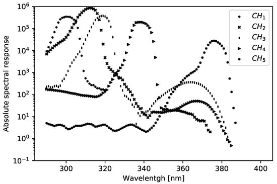 The response functions were characterized with a 1 nm resolution. Throughout this study, channels 1, 3 and 5 were used. Channel 3 is significantly less sensitive to ozone abundance than channel 1, so the ratio of the two is a good choice for TOC amount retrieval. At (channel 5), the ozone cross-section is near minimal. Therefore, channel 5 is relatively insensitive to ozone but is responsive to clouds, aerosol particles, and surface albedo. Hence, channel 5 is optimal for quantifying the impact of clouds, aerosols and surface reflection on the measured radiation field through the radiation modification factor (RMF) defined in Equation (1) below. The absolute response of these channels span over the whole range mentioned above, i.e., 290 nm nm with a 1 nm resolution.