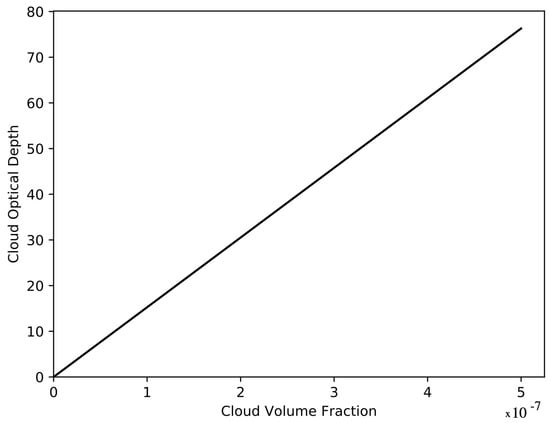 Clouds were assumed to consist of a collection of homogeneous water spheres having a single-mode log-normal volume size distribution with a specified volume mode radius μm and width . Clouds were placed between 2000 m and 4000 m altitude, and a Mie code was used to compute the inherent optical properties of cloud particles. To convert the cloud volume fraction to cloud optical depth, repeated AccuRT simulations were conducted to obtain at different cloud volume fractions. The results are shown in Figure 2. The exact formulation of the relationship between versus is presented in Appendix A.