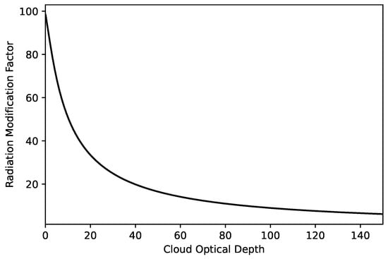 The cloud optical depth (COD) is not used as a direct input to AccuRT. Instead, the cloud volume fraction () is used in conjunction with the cloud extinction coefficient to generate the cloud optical depth at 380 nm, . The relationship between the cloud volume fraction () and the cloud optical depth is shown in Figure 2 below.