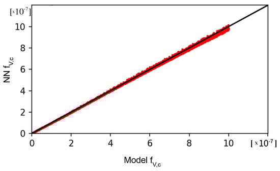 Holdout validation involves splitting the dataset into two separate sets: one for training the model and one for testing it. The K-fold validation divides the dataset into K equal parts, or “folds”. The model is trained and tested K times, each time using a different fold as the test set and the remaining folds as the training set. This approach ensures that every data point is used for both training and validation. After data processing, and setting up the training (defining loss function, selecting an optimizer, determining the learning rate and number of neurons), the neural network was ready for the supervised learning and the synthetic data were applied for the training. To validate the results, two procedures were used. First, a 75:25 holdout, and then, a K-fold validation for (see Section 5.3) was applied. For the holdout method [18] (Section 8.2.2), the mean percent error (PE), the mean absolute percent error (APE) and the squared correlation coefficient ( were calculated using 5000 data points of the neural network (MLNN) predictions versus the modeled results described in Section 4. The APE and PE are defined as follows: