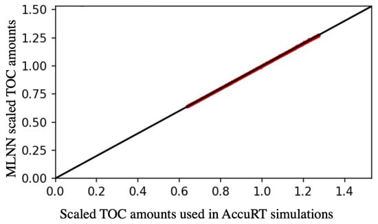 In Figure 5, the red color indicates the values from the trained MLNN and the model data. The x-axis represents the scaled TOC amounts used in AccuRT for the simulations. The TOC amount is scaled to the standard US atmosphere [10], where the equivalent TOC depth is m, which in Dobson units corresponds to 345 DU. The lower and upper limits of the modeled TOC amounts (220 DU, 440 DU) correspond to 0.6377 and 1.2754, respectively, in terms of scaled ozone amounts. The strong correlation between the data points is evident from Figure 4, Figure 5, the high value, and the low error rates. The calculated statistical parameters are provided in Table 3.