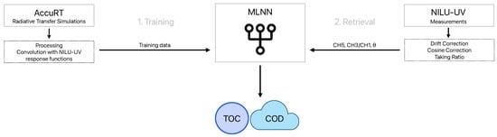 A combination of radiative transfer simulations based on AccuRT [4], machine learning methods and irradiance measurements has been used to infer TOC and COD values. First, radiative transfer simulations were used to create synthetic training data for a neural network. After establishing the neural network, we used the synthetic dataset, with the absolute response functions of the NILU-UV applied to it, for training. Once the training was completed, we undertook the validation of the results. This step was followed by the preparation of the collected NILU-UV raw data to be used as input to the neural network for obtaining the TOC and COD values. Once the TOC results had been obtained, they were compared to the OMI values, and statistics were calculated to quantify their similarities/discrepancies. In the following sections, we describe (i) the instrumentation, (ii) the radiative transfer simulations, (iii) the neural network approach, (iv) the NILU-UV and OMI data preparation, (v) the results of our research, and finally, (vi) our conclusions.