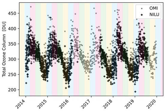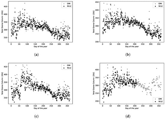 The retrieved TOC amounts from the NILU-UV and OMI measurements versus day of the year are plotted for the years 2014, 2015, 2018 and 2019 in Figure 7a–d. Plots for the years 2016 and 2017 are provided in the Appendix A.