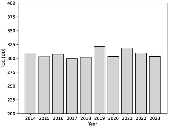 Unfortunately, due to technical difficulties, after 2019, the availability of reliable NILU-UV data dropped significantly, but to create an up-to-date overview of the annual TOC amounts, the missing data points were replaced by data from OMI. The yearly TOC amounts are shown in Figure 9.