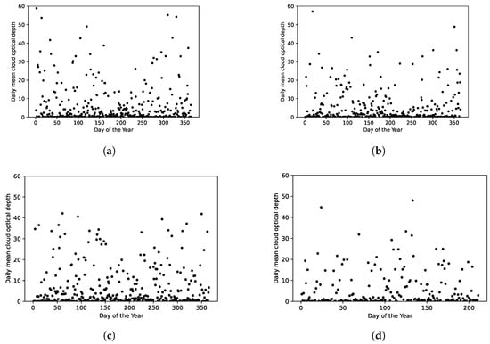 As mentioned in Section 4, one output of the neural network is the cloud volume fraction, , which is converted to COD values at 380 nm, as shown in Figure 2. The results for the years 2014, 2015, 2018 and 2019 are shown in Figure 10a–d.