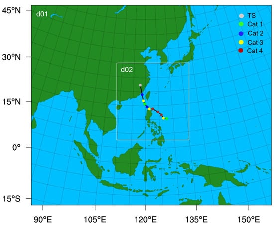 The two nested domains of the WRF model for Doksuri during the simulation time. The outermost box and white box denote the outer and the inner domains, respectively. The black line with color dots at intervals of 12 h indicates the best track from the IBTrACS from 1200 UTC 23 July to 1200 UTC 28 July 2023. The color of the dots represents different typhoon intensity categories according to the Saffir–Simpson scale for Typhoon Doksuri (2023).