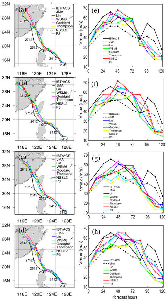 Tracks of Typhoon Doksuri including the best track data from IBTrACS (solid black line) and JMA (dashed black line) as well as simulated tracks from sensitivity experiments that combined the CPSs (a) KF, (b) GF, (c) GD, and (d) New Tiedtke with different MPSs (solid colored lines) during the period from 1200 UTC 23 July to 1200 UTC 28 July 2023 (0 to 120 forecast hours). The circle symbols indicate the time every 24 h. (e–h) as in (a–d), respectively, but for the 10 m maximum wind speed (Vmax, m s−1). The blue, green, magenta, yellow, red, and cyan lines denote the cloud microphysics schemes Lin, WSM6, Goddard, Thompson, NSSL2, and P3, respectively.